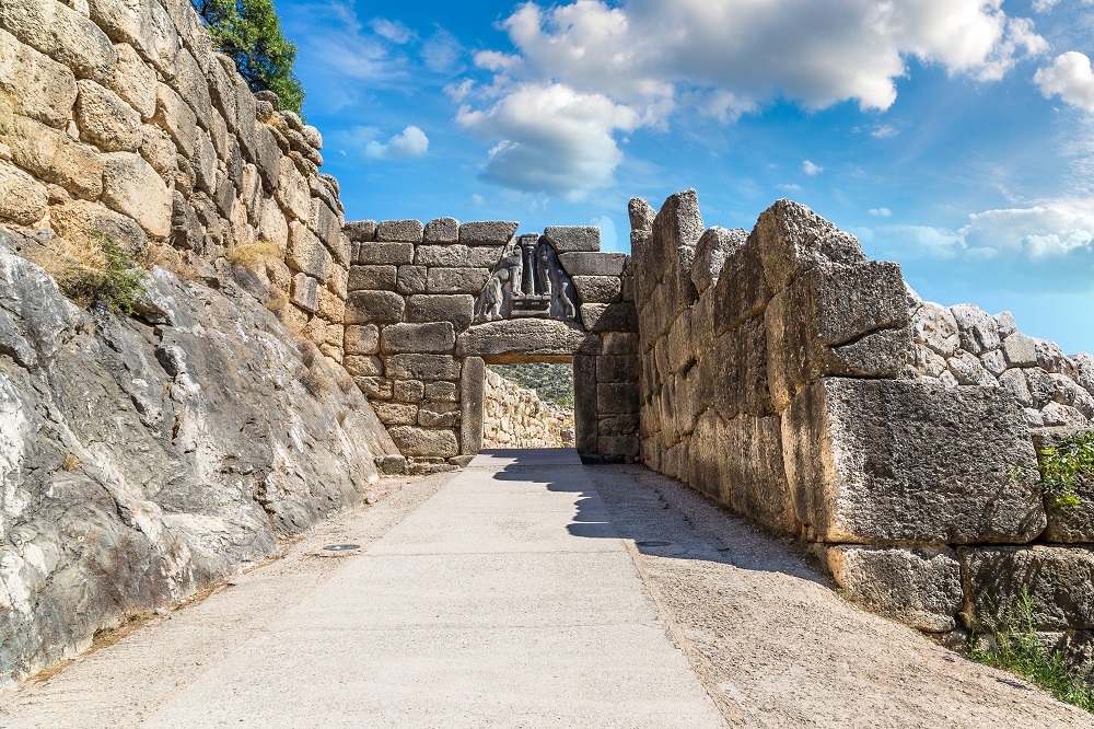 Mycenae, ‘Rich in Gold’, was the kingdom of mythical Agamemnon who dominated the Aegean Sea after the distraction of the Minoan Empire . The city looks out across the plain of Argos to the sea. Its elevated position and its huge Cyclopean Walls offered protection from surprise attacks by pirates and enemies. At the peak of its power (1300 B.C.) the population resided around the fortress where the Royal Family resided. The Palace, symbol of power of the Mycenaean rulers, was reached by a large ramp beginning at the Lions Gate.